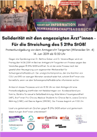 Anlässlich dieses Prozesses wird ab 10.30 Uhr vor dem Amtsgericht eine Protestkundgebung stattfinden mit Redebeiträgen von: Bundesverband pro familia, Bündnis für sexuelle Selbstbestimmung, Arbeitskreis Frauengesundheit (AKF), Ärzt*innen Pro-Choice, Medical Students für Choice Berlin, sowie Cornelia Möhring (LINKE) und Gesine Agena (Grüne). Der Prozess beginnt um 11.30 Uhr.